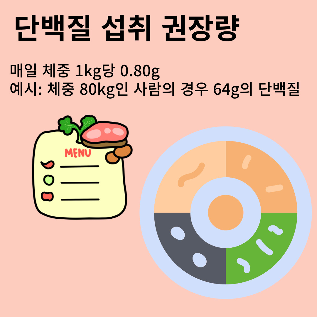 미국 의학아카데미 산하 식품영양위원회에서 추천한 섭취량입니다. 체중 80kg 정도인 사람이 매일 64g의 단백질을 먹으려면, 신경을 많이 써야할 것 같습니다.