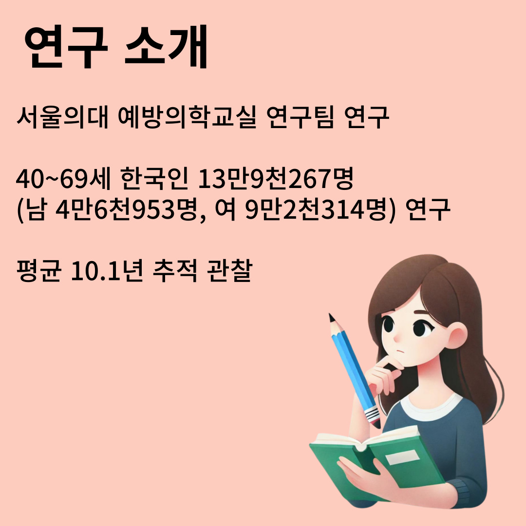 이 연구는 서울의대 예방의학교실 연구팀이 하였습니다. 한국인 13만9천267명을 10.1년 동안 추적/관찰한 결과입니다.