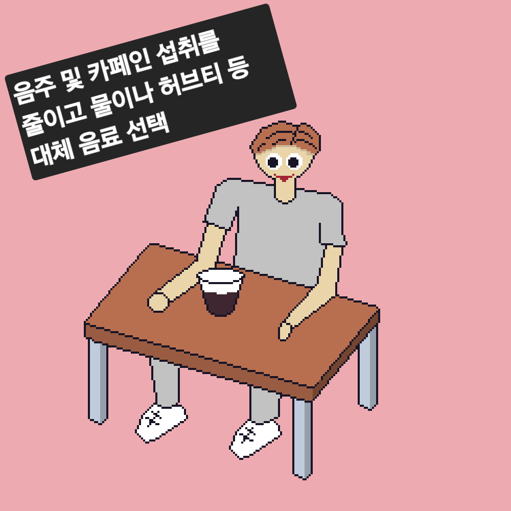 • 음주 및 카페인 섭취를 줄이고 물이나 허브티 등 대체 음료 선택