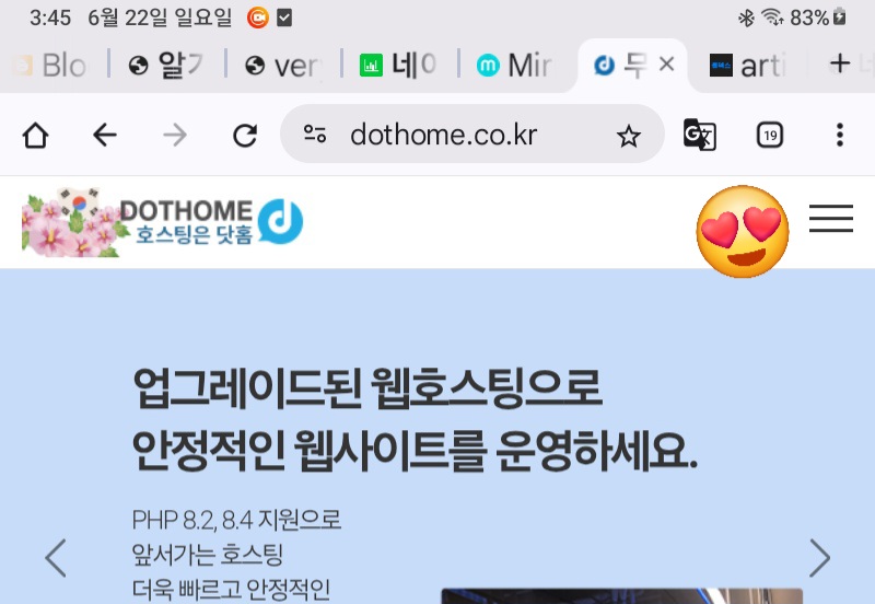 닷홈 싸이트에 접속하여 로그인 후 우측 상단의 메뉴 버튼을 누릅니다.