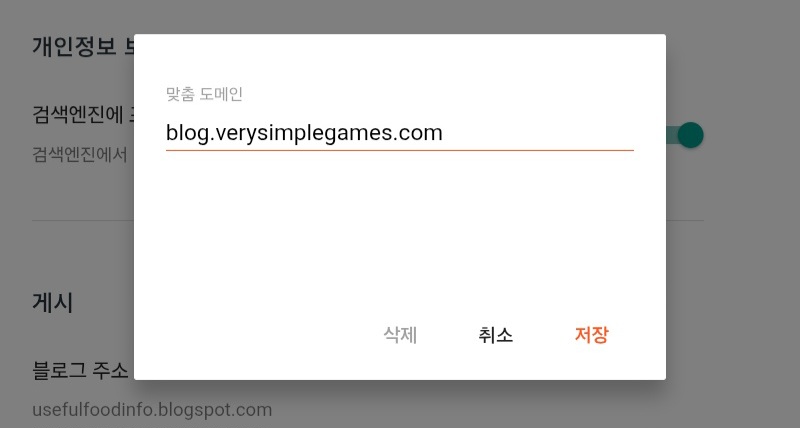 블로그스팟 설정 화면을 내리면, '맞춤 도메인'이 보입니다. 여기를 누르면 아래와 같은 창이 나옵니다.