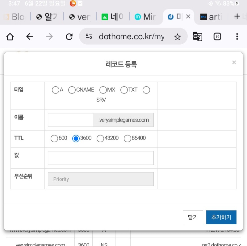 기존에 있는 것들은 이 도메인과 기존 내 홈페이지를 연결하기 위한 정보들로 손대면 안됩니다. 여기에 블로그스팟에서 사용할 하위도메인만 추가하면 됩니다. 왼쪽 위에 있는 '레코드 추가' 버튼을 누릅니다.