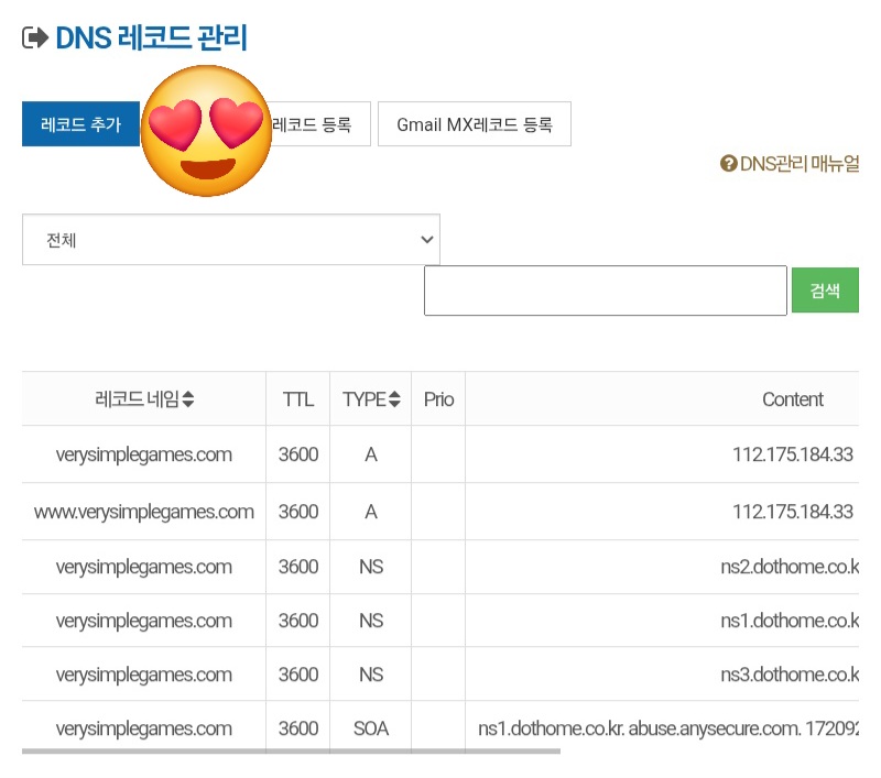 여기서 하위도메인을 추가하려는 도에인의 'DNS 레코드 관리'를 누릅니다.