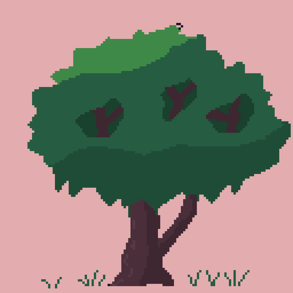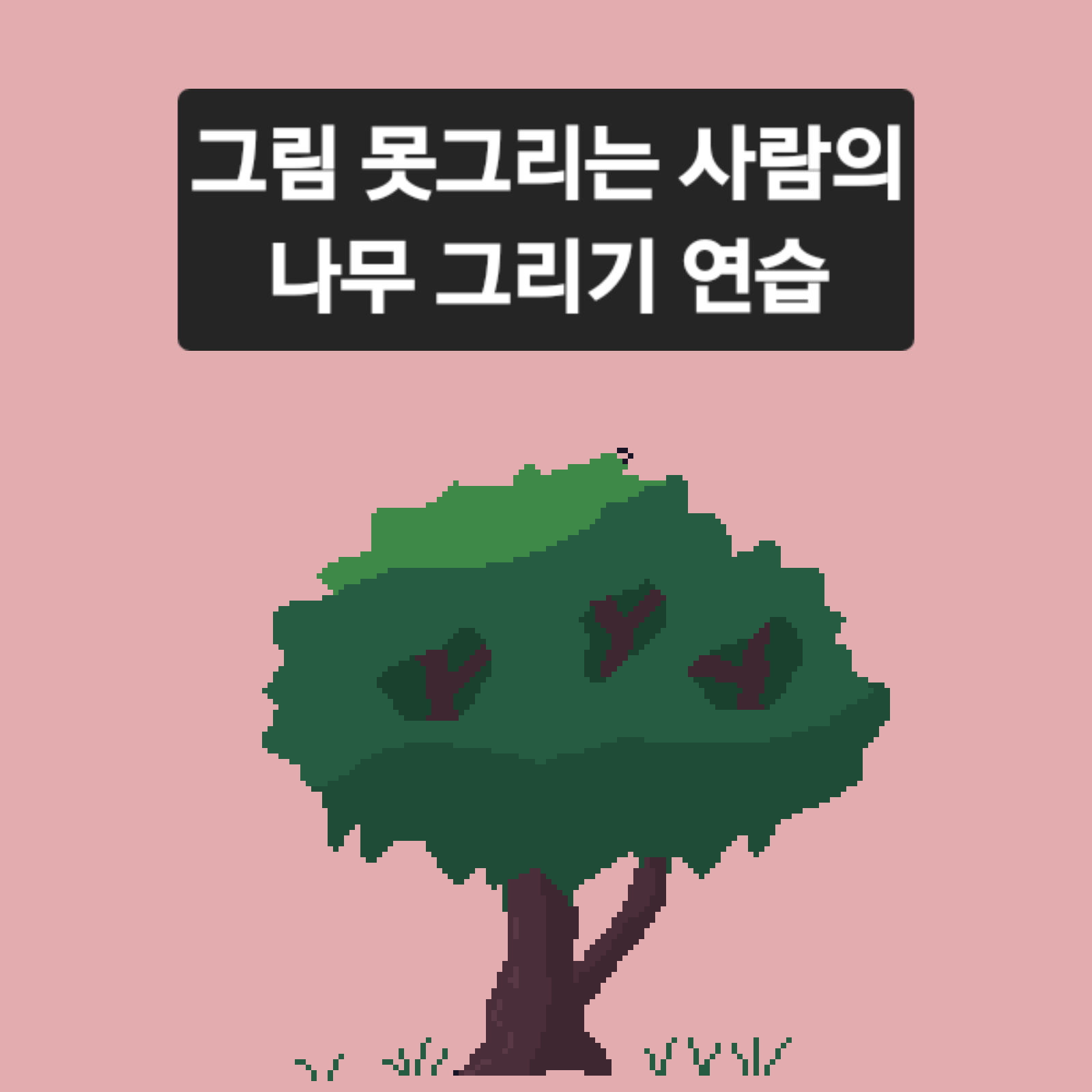 나무잎 부분을 3단계 어두움으로 칠했습니다. 기둥 부분도 경계를 그리지 않았지만, 2단계 명암으로 칠했습니다.바닥 부분에 풀을 그려서 완성하였습니다.