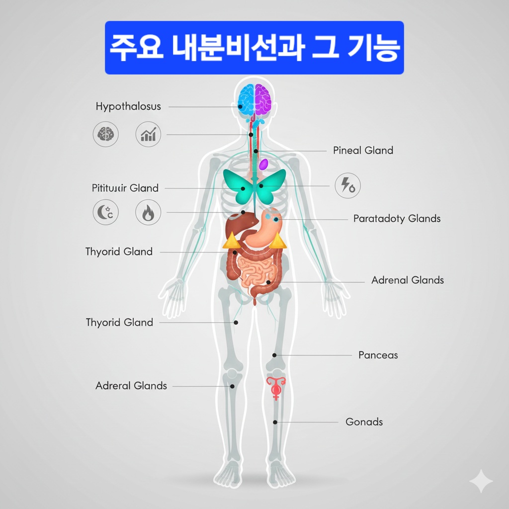 우리 몸의 내분비계는 호르몬을 분비하여 신체 기능을 조절하는 중요한 시스템입니다. 다음은 주요 내분비선과 그 역할에 대한 설명입니다.